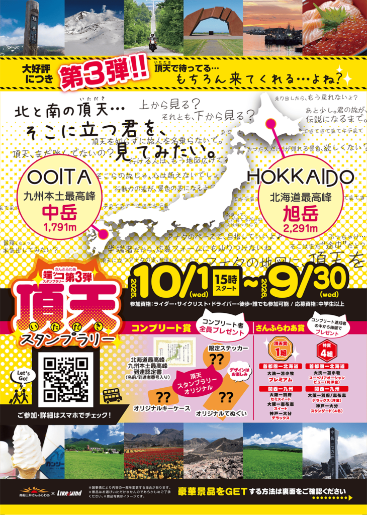 商船三井さんふらわあが,昨年に続き「端っこスタンプラリー」を10月から開始した。第3弾はフェリーの利用と登山を組み合わせたもので,題して“さんふらわあ端ッコスタンプラリー第3弾 頂点スタンプラリー”。さんふらわあ4航路のうち2航路を利用し,北海道最高峰の旭岳と九州本土最高峰の中岳を訪れる企画で,船内および指定地点でスタンプを取得することで参加できる。コンプリート者全員に名前,到達番号入り最高峰到達証明書や限定ステッカーなどを贈呈し,抽選で乗船券も当たる。実施期間は10月1日から2026年9月30日まで。参加資格は中学生以上で,陸路の移動手段は問わない。スタンプラリーは2023年の商船三井フェリーとフェリーさんふらわあの事業統合を記念して始めたもので,第1弾は最北端と最南端の岬,第2弾では最東端と最西端の岬を巡る企画で実施した。