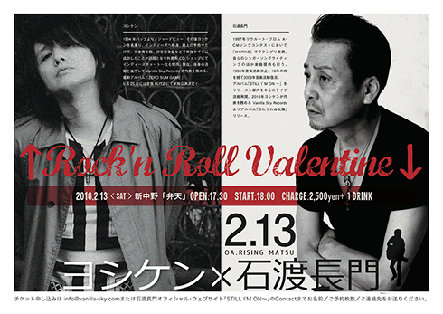 石渡長門オフィシャルウェブサイトの Contactより件名(ヨシケン×石渡長門2マンライヴ「ROCK'N ROLL VALENTINE」」 2/13)お名前、予約枚数、連絡先をご記入のうえ、お申込ください。